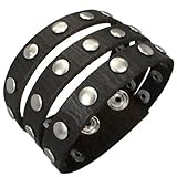 Rocker style cuff bracelet in quality black leather has rows of silver studs. Awesome style, this looks like 3 separate bracelets on the top, yet closes with just a snap at the bottom. Adjustable for men and women. Snaps at 7.5 and 8.25 inches. 1 3/8 inches wide. ...Read more Details